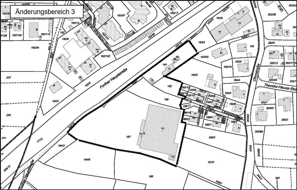 Im Zuge der 8. Änderung wurden auf Grundlage des rechtskräftigen BBP/GOP Brand Nr. 20 „Am Lavendelweg“ die Flächen des „ÄB 1“ zwischenzeitlich als „Allgemeines Wohngebiet“ gemäß § 4 Abs. 1 und 2 BauNVO inkl. dazugehöriger Erschließungsstraßen (öffentliche Verkehrsflächen) entwickelt. Die Flächen des „ÄB 2“ wurden auf Grundlage des rechtskräftigen BBP/GOP Eckenhaid Nr. 17 „Südlich der Flurstraße“ zwischenzeitlich als „Allgemeines „Wohngebiet“ gemäß § 4 Abs. 1 und 2 BauNVO inkl. der dazugehörigen Erschließungsstraßen (öffentliche Straßenverkehrsflächen) und Flächen für die Abwasserbeseitigung (zur Errichtung eines Regenrückhaltebeckens) entwickelt. Die im „ÄB 3“ als Sonderbauflächen dargestellten Bereiche wurden auf Grundlage des rechtskräftigen BBP/GOP Forth – Süd Nr. 10 „Sondergebiet großflächiger Einzelhandel südwestlich der Ohmstraße“ zwischenzeitlich als „Sonstiges Sondergebiet“ mit der Zweckbestimmung „Großflächiger Einzelhandel“ gemäß § 11 BauNVO baulich entwickelt, die restlichen Flächen werden in gemischte Bauflächen (§ 1 Abs. 1 Nr. 2 BauNVO) geändert. Im „ÄB 4“ werden Flächen in gemischte Bauflächen (§ 1 Abs. 1 Nr. 2 BauNVO), in Verkehrsflächen (§ 5 Abs. 2 Nr. 3 BauGB), Bahnflächen (§ 5 Abs. 2 Nr. 3 BauGB), öffentliche Grünflächen (§ 5 Abs. 2 Nr. 5 BauGB) und in einen Grünzug (Siedlungsflächendurchgrünung) geändert. Im „ÄB 5“ wurden die vormals vorhandenen, landwirtschaftlich genutzten Flächen zwischenzeitlich auf Grundlage vorliegender Genehmigungen bebaut und sind als Teil des nunmehr erweiterten Recyclinghofes in Betrieb. Im „ÄB 6“ werden Wohnbauflächenflächen in Grünflächen (§ 5 Abs. 2 Nr. 5 BauGB) geändert.