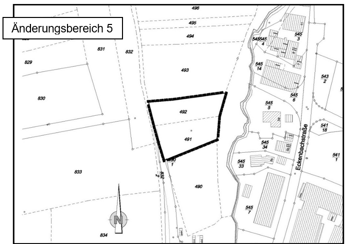 Der „ÄB 5“ befindet sich am östlichen Siedlungsrand des Ortsteiles Eschenau, nördlich des Recyclinghofes Eckental in der Schnaittacher Straße. Der Geltungsbereich umfasst eine Fläche von ca. 0,22 ha und beinhaltet vollflächig die Grundstücke mit den Fl.-Nr. 491 und 492 (beide Gemarkung Eschenau).