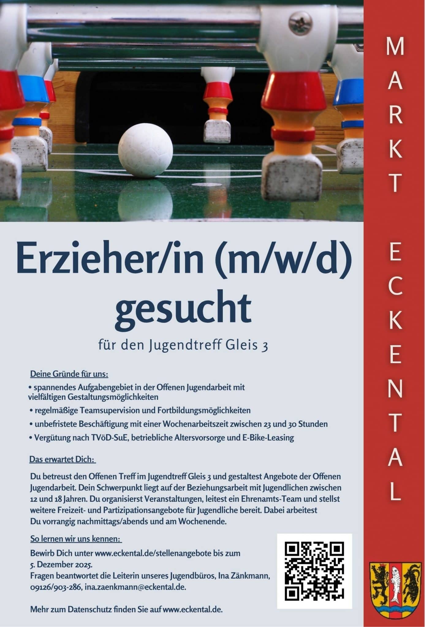 Erzieher/in gesucht! Wir suchen für den Jugendtreff Gleis 3 ab 01.06.2026 eine/n Erzieher/in mit 23-30 Wochenstunden. Weitere Infos hier.