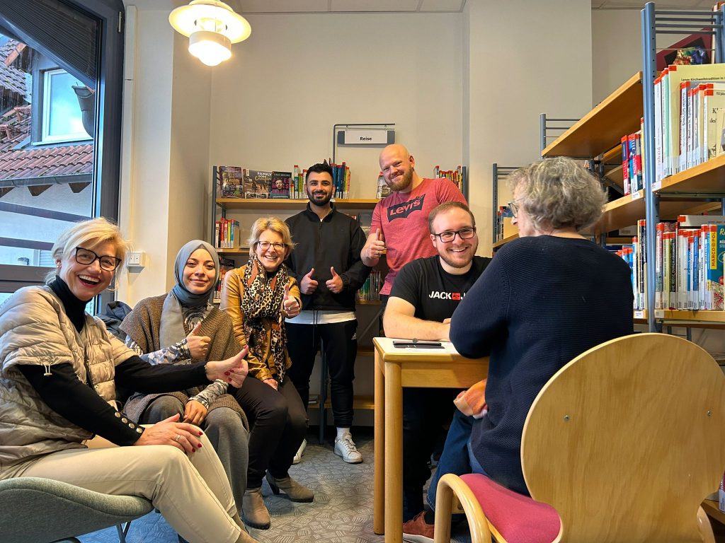 Die zusammen.digital-Fahne vor der Marktbücherei zeigt es in Zukunft an: Wenn sie freitags draußen steht, hat im ersten Stock die Beratungstheke geöffnet. Zwei junge Ehrenamtliche warten dann dort und helfen Ratsuchenden allen Alters bei digitalen Problemen mit Internet, Handy oder Tablet. Die erste Beratungstheke am 16. Juni – dem bundesweiten Digitaltag – war ein echter Erfolg: Die beiden ehrenamtlichen Berater Juan Meslem und Florian Prohaska waren während der gesamten Öffnungszeit über beschäftigt.